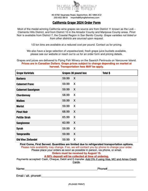 Print it off, fill it out and bring it in to the shop to order your grapes! If you have any questions, please contact us at 250-652-8818 or imports@flyingfishwinery.com.