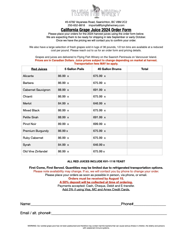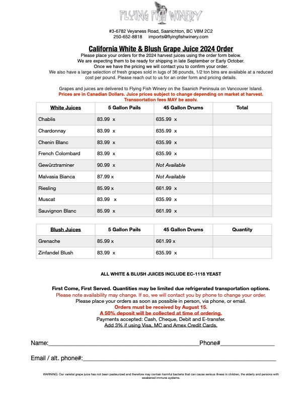 Print it off, fill it out and bring it in to the shop to order your juice! If you want to email your order form please send it to imports@flyingfishwinery.com. If you have any questions, please contact us at 250-652-8818 or via email at imports@flyingfishwinery.com.